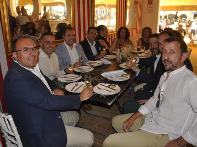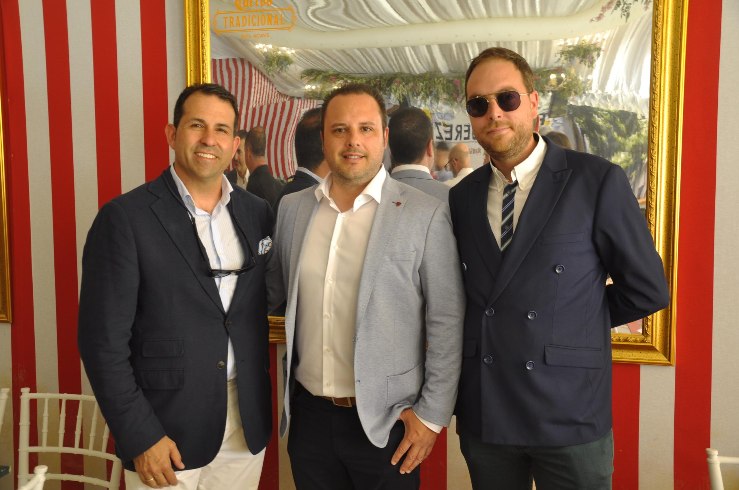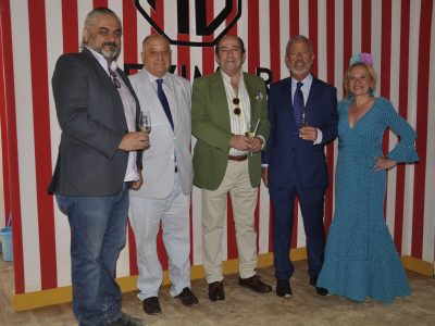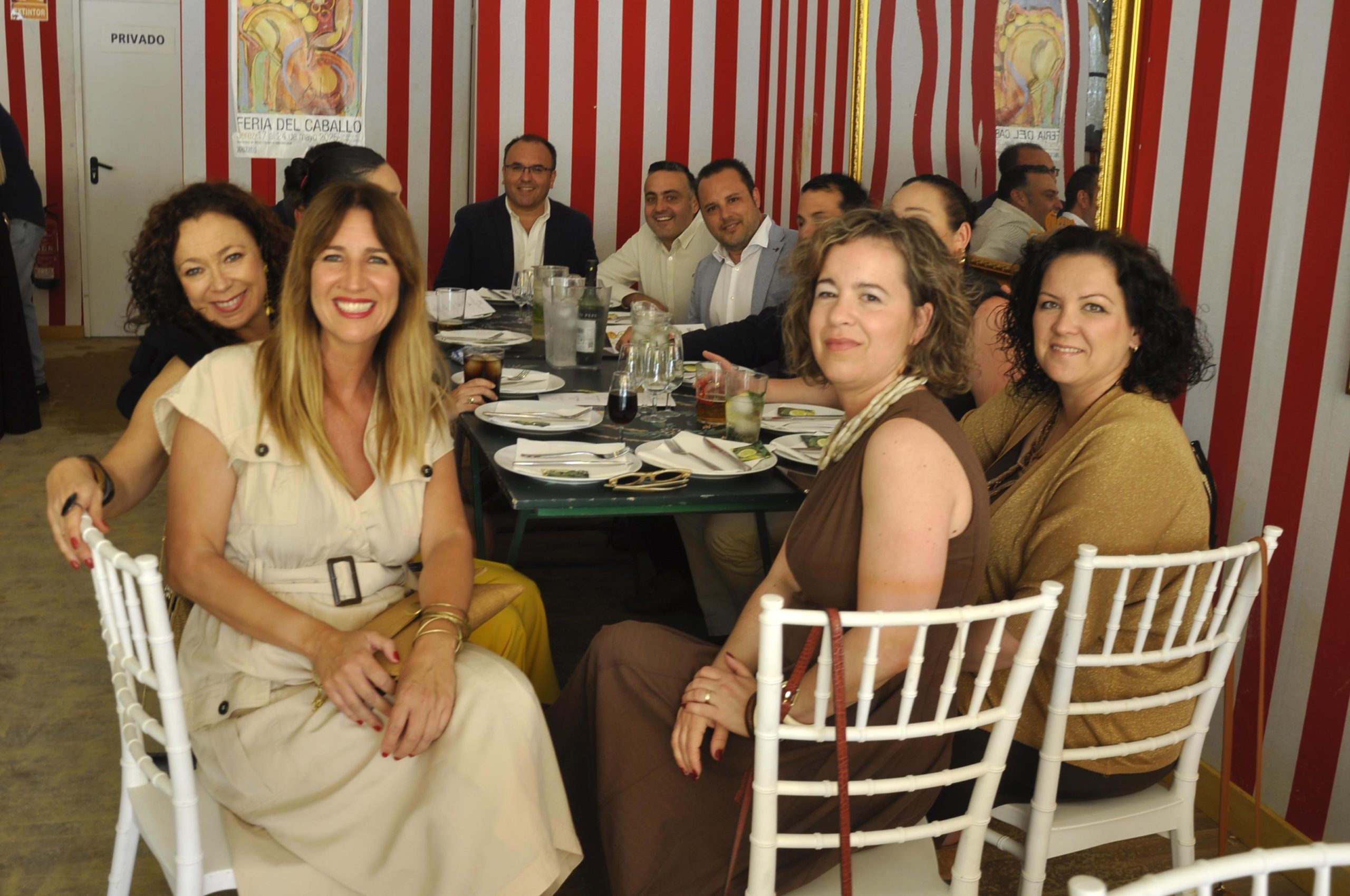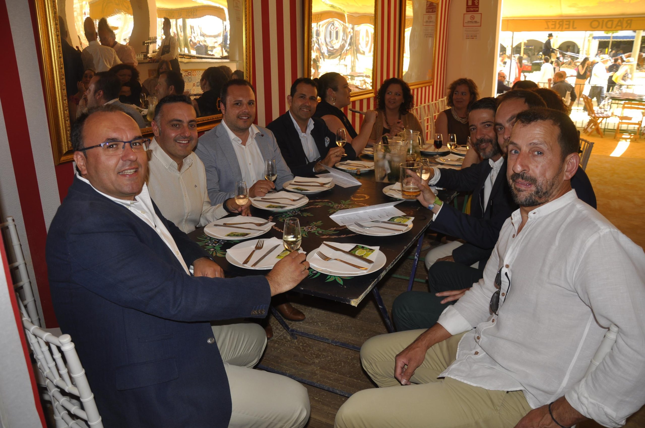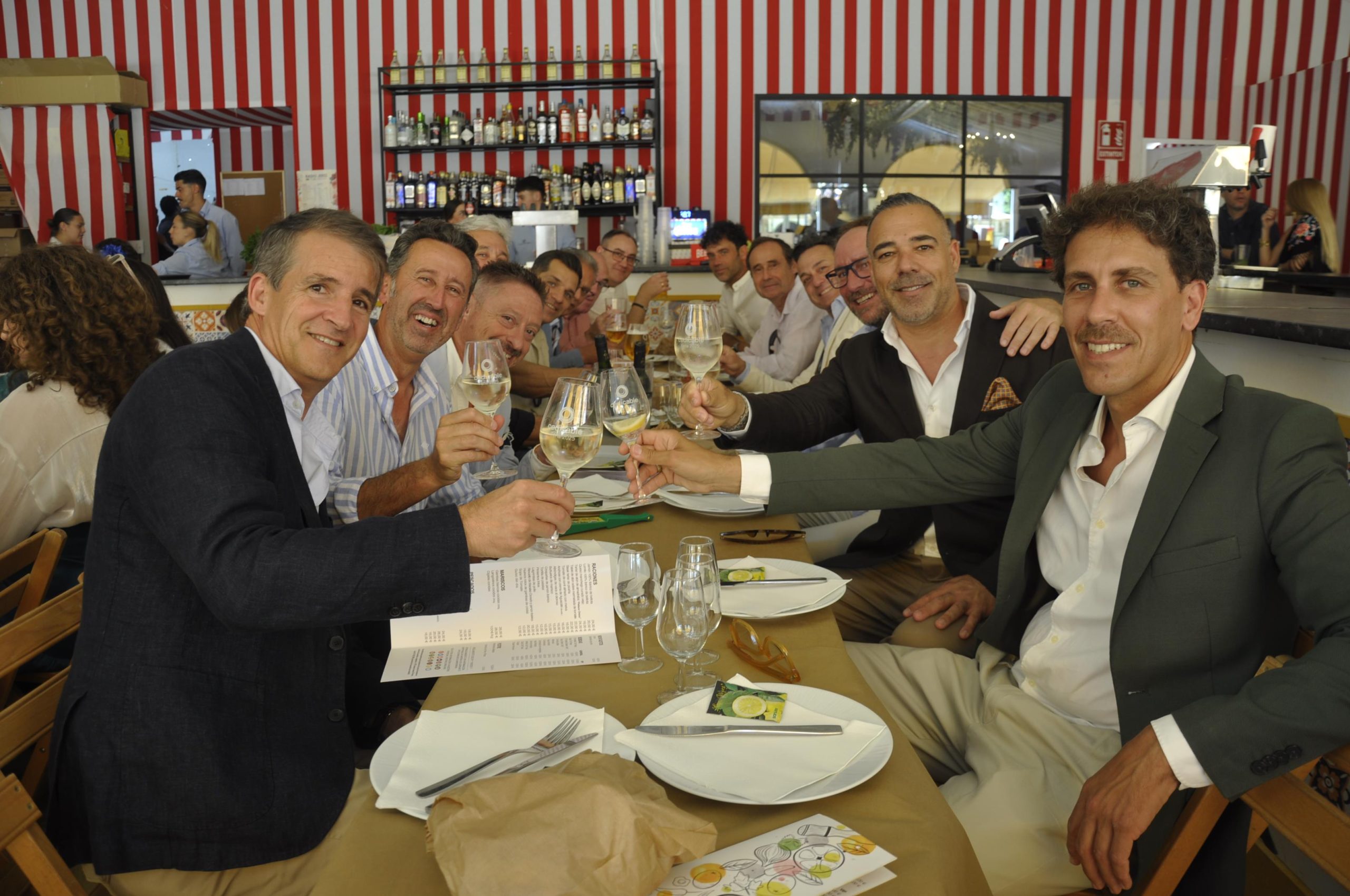 Javier Martínez, delegado de González Byass Málaga, junto a un grupo de amigos disfrutando en la caseta de Radio Jerez